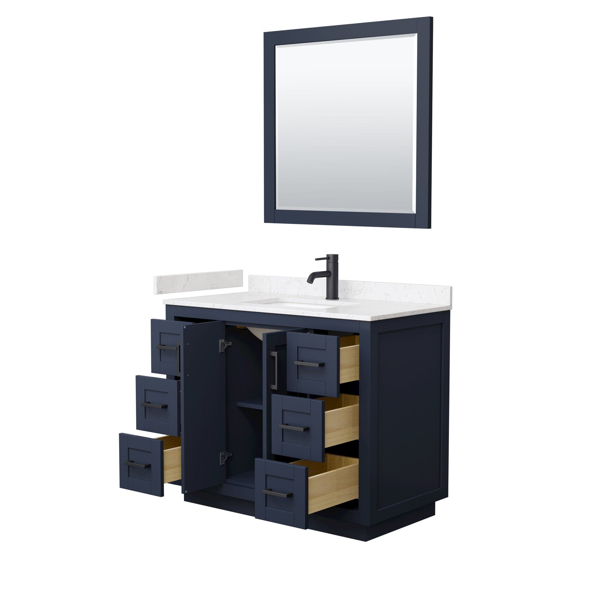 Wyndham Collection WCF292942SBBC2UNSM34 Miranda 42 Inch Single Bathroom Vanity in Dark Blue, Light-Vein Carrara Cultured Marble Countertop, Undermount Square Sink, Matte Black Trim, 34 Inch Mirror